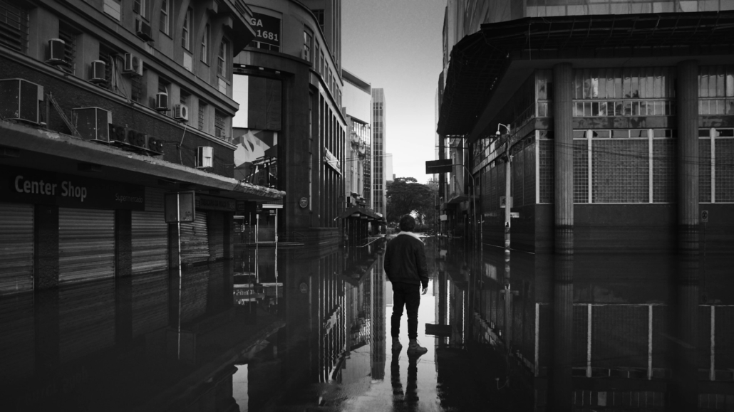 Um corpo segue na correnteza por uma capital submersa.